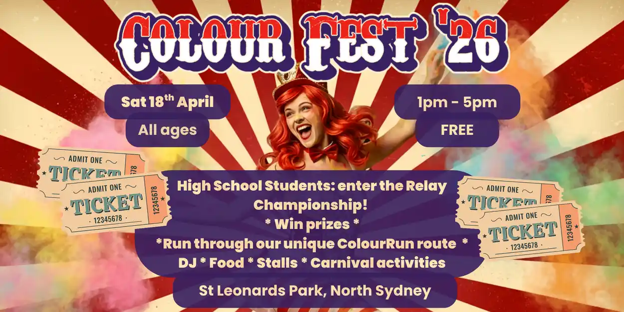 Then at 3pm, take your marks, get set, GO π... and let the free-for-all Colour Run fun begin. Dash through the park while we dust you in colour powder. How fast can you complete the course? Can you do it more than once? Join in on fun obstacle course activities, recharge with food and refreshments!